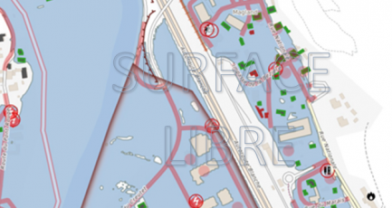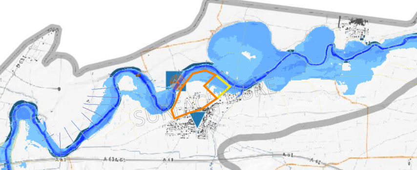 Ci dessous, un focus local : la zone inondée projetée est produite à chaque simulation. on retrouve également les niveaux de vigilance affichées aux stations (cercles concentriques) ou évalués sur une zone d'intérêt particulier.