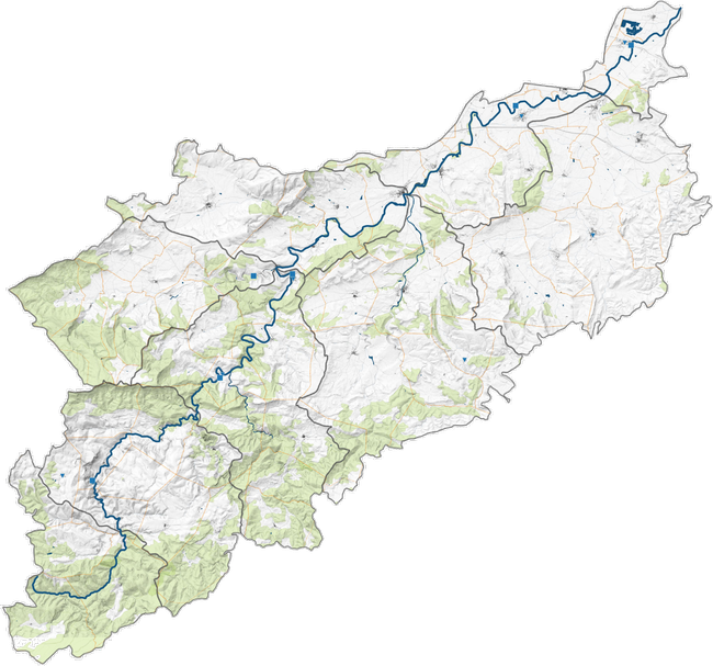 La seconde vue correspond à un focus local. Elle affiche la zone inondée calculée automatiquement par croisement avec un modèle numérique de terrain et apporte un détail supplémentaire sur les niveaux d'alerte, en représentant les secteurs d'intérêt repris dans les PCS et leurs niveaux de vigilance respectifs dans la prévision.